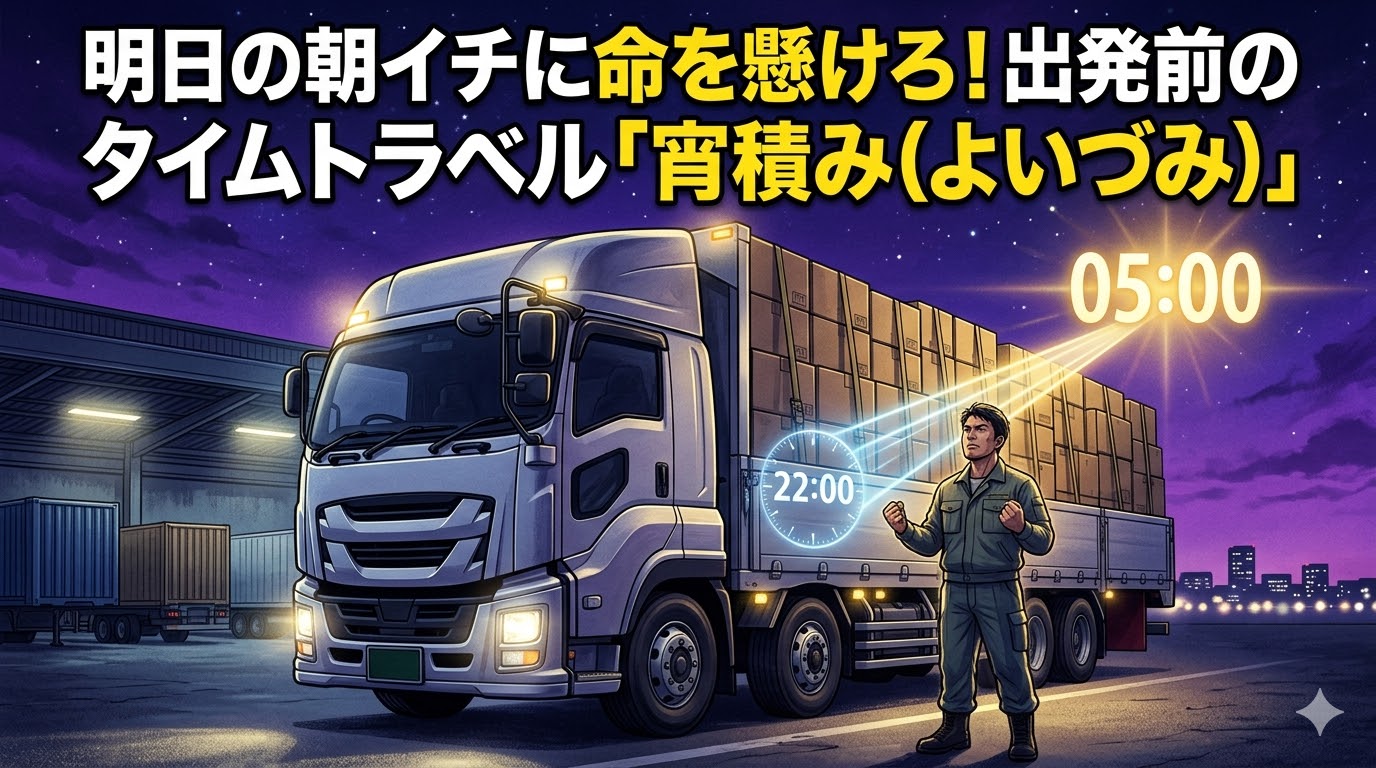 宵積み(よいづみ)は、物流現場では日常的に行われている超・基本のオペレーションです。反対語は、当日の朝に出発直前に積む「朝積み(あさづみ)」です。
